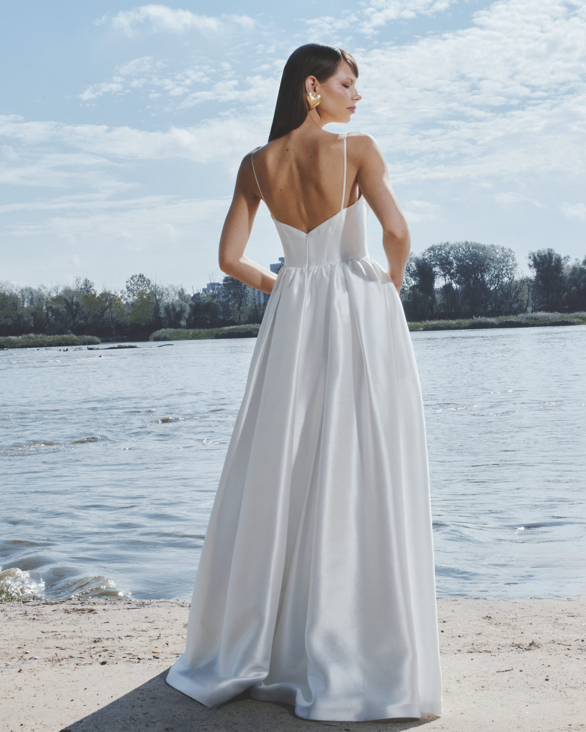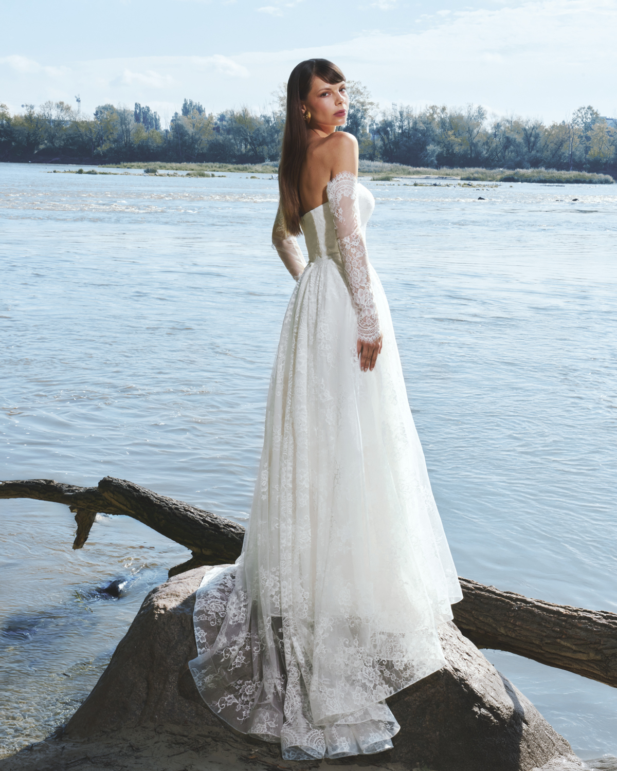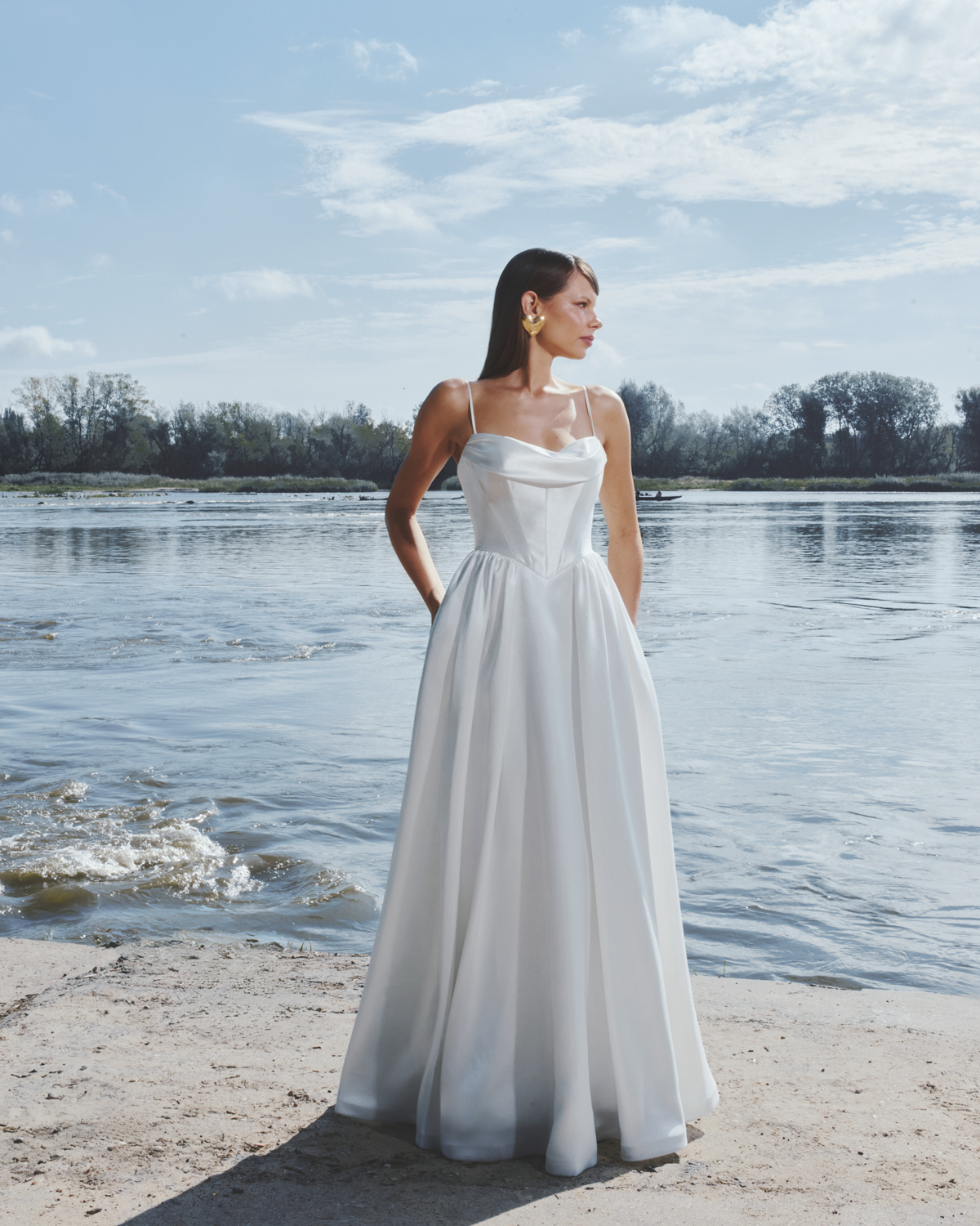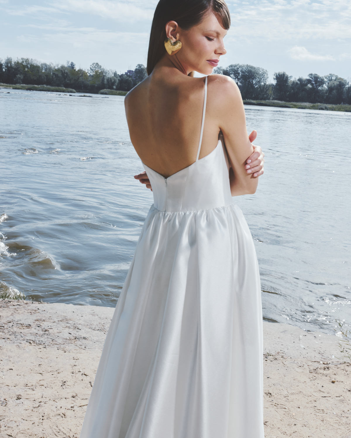 Satin gleitet über den Körper wie Wasser, Spitze umhüllt die Haut wie eine sanfte Berührung. Im Studio – reine Form. An der Weichsel – Freiheit und Leidenschaft. Diese Kollektion zeigt: Wahre Eleganz braucht keine Bühne, um alle Blicke auf sich zu ziehen. Amy ist Freiheit – leicht wie Luft, mit einem Hauch von Provokation. Brautkleider für Frauen, die keine Angst haben, gesehen zu werden. Eleganz, die verführt. Schlichtheit, die verlockt. Subtilität, die am unwiderstehlichsten wird.